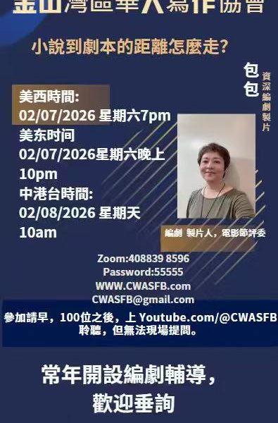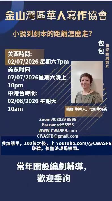 Homepage20262026/02/07 Screen Writing Workshop 2026 2026/02/07 Screen Writing Workshop LYDTE Posted on February 12, 2026 专业编剧教你如何成为一名剧本写作者。包包老师是专业编剧,是门槛很高的编剧协会会员,编剧多部影视剧上映并获奖,也是多个国际电影节评委。 LYDTE View all posts Post navigation Previous Post2026/01/24 沈乔生老师荒诞小说研讨会——荒诞小说的现实意义。 You Might Also Like 2026 2026/01/24 沈乔生老师荒诞小说研讨会——荒诞小说的现实意义。 LYDTE January 24, 2026
