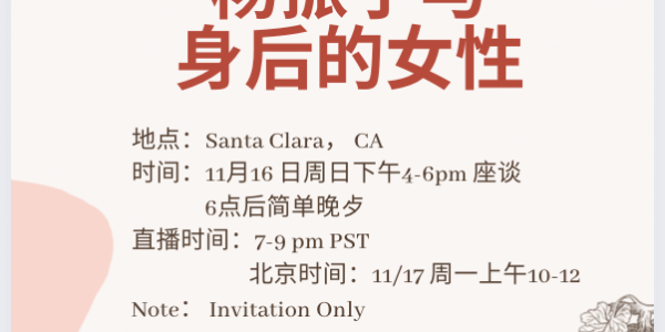 杨振宁先生千古,我们组织一个小型活动,题目是《杨振宁与身后的女性》。 地点:Santa Clara, CA。时间:11月16 日周日下午4-6pm 座谈,然后简单晚歺。 直播时间:7-9 pm PST (北京时间:11/17 周一上午10-12)。 内容包括:1)杨振宁先生的生平中,最感动你的1-2件事情;2)杨先生的母亲,如何成就了他不平凡的一生;3)翁帆的爱情及事业;与杨先生20 年的相依为伴及互相依赖,如何造就了她独特的魅力,及铺垫了未来的发展。 主持人: xiaofeng zhang